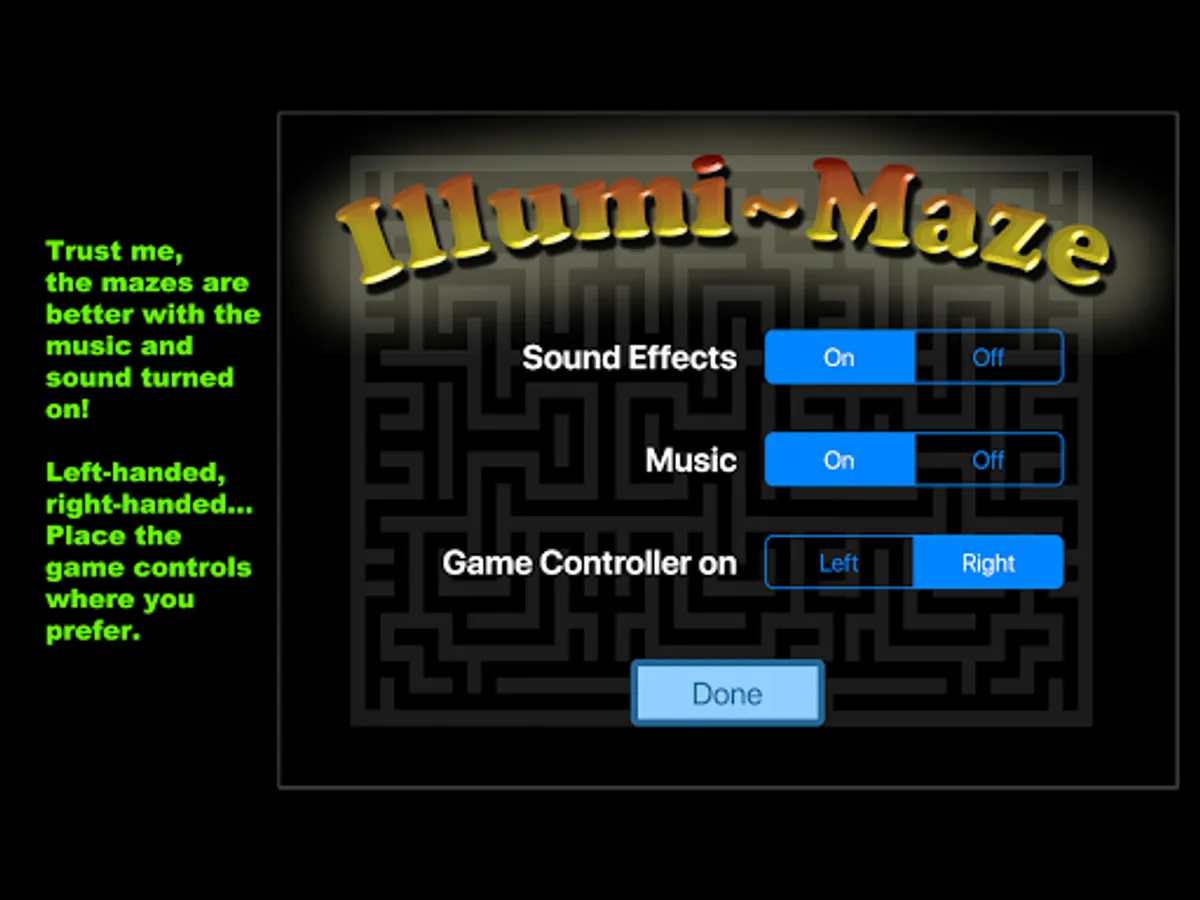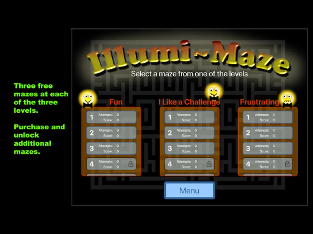 IllumiMaze is free and comes with nine free mazes - three at each of the three levels - "Fun," "Challenge," and "Frustrating". Additional mazes can be purchased and unlocked.