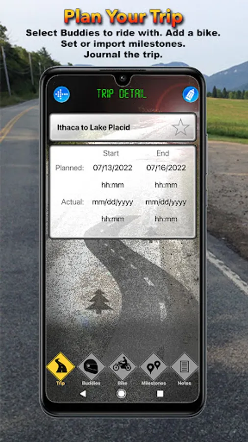 Add notes about the trip. Add notes to each milestone. Add photos to each milestone. Share your trip by posting to Facebook or sending an email. Record the date and time you achieve each milestone.