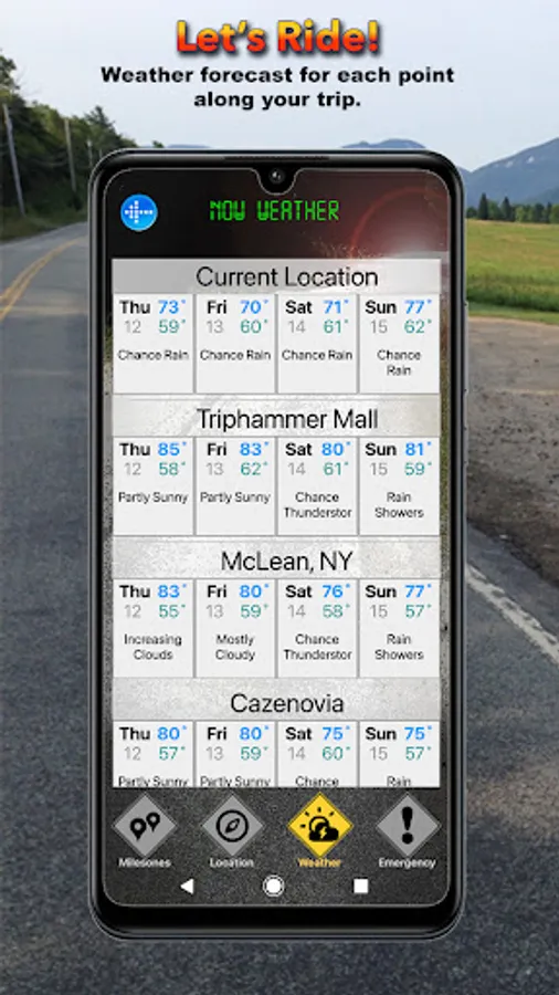 - A three-day weather forecast for your current location and for each of your upcoming milestones.