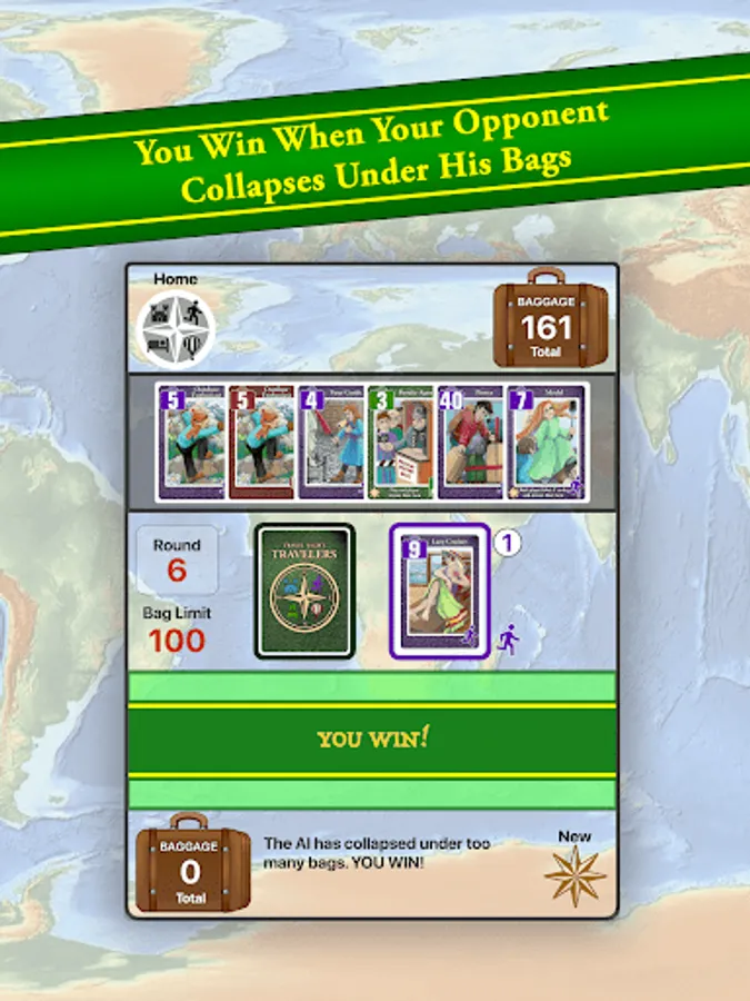 Your aim is to discard as much baggage as possible while weighing down your opponent with luggage. The game ends once one of you reaches the limit of the bags you can carry. The one who has travelled with the least baggage wins the game.