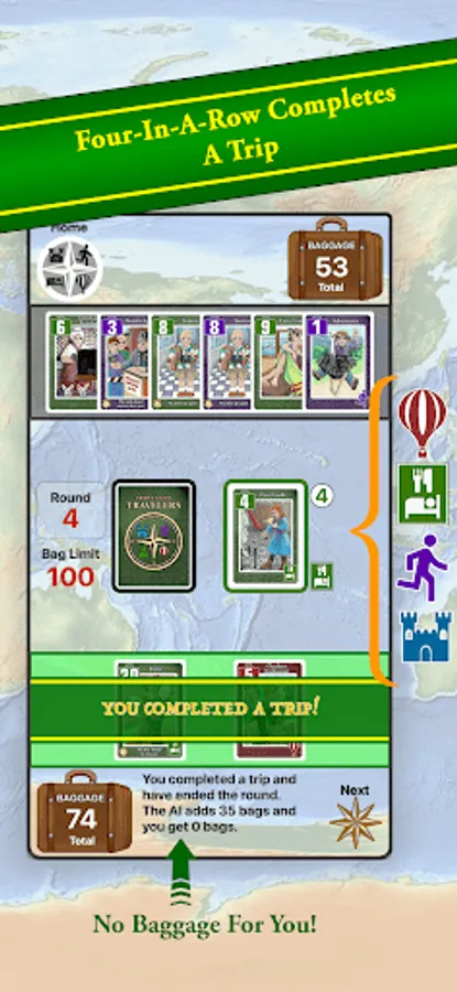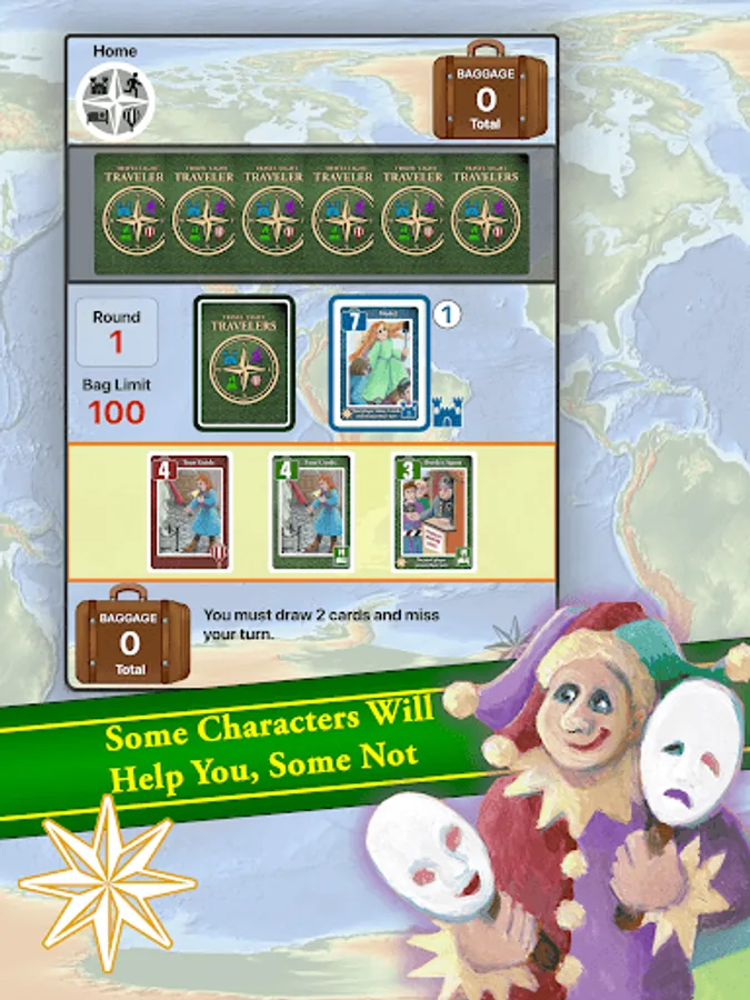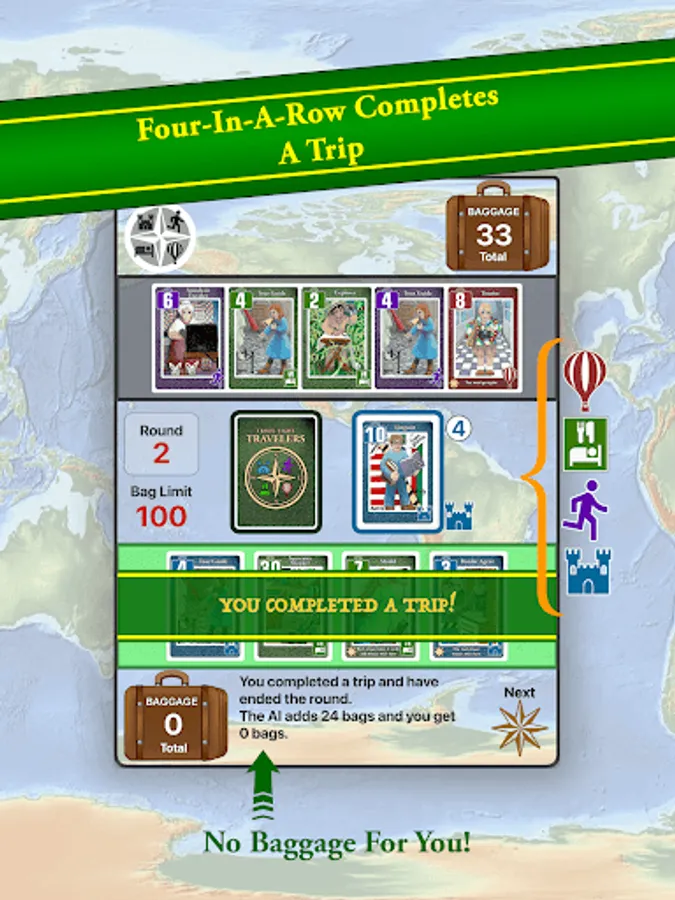 There are four suits: Site, Transport, Food & Lodging, and Activity, each with thirteen unique travel characters. The game will take you on a journey where you will meet these Travelers who add to the luggage you're carrying. Some Travelers may also help you discard luggage, some may help you weigh down your opponent with luggage and some may prevent you from discarding.