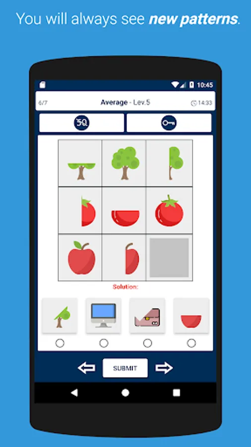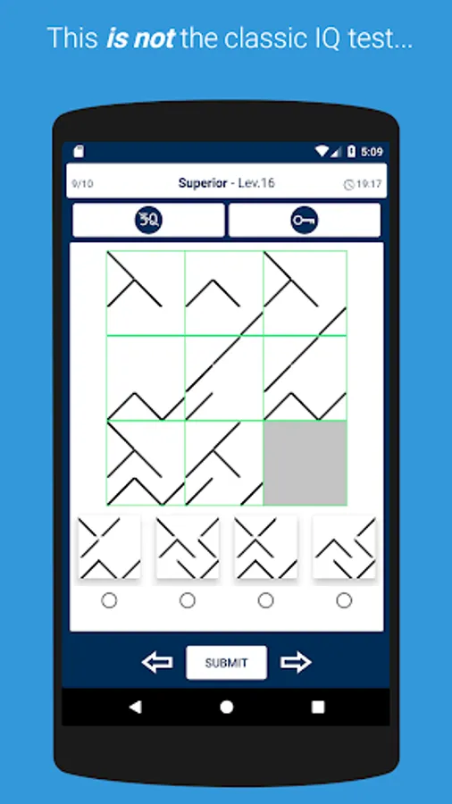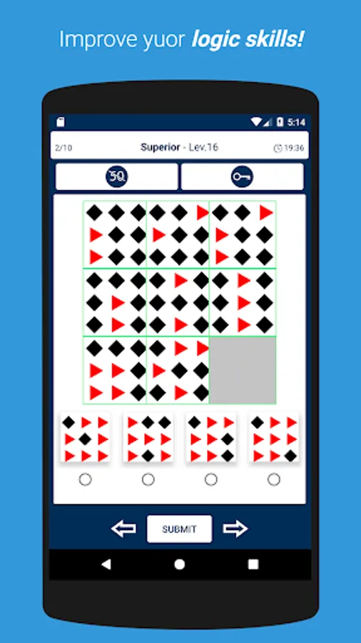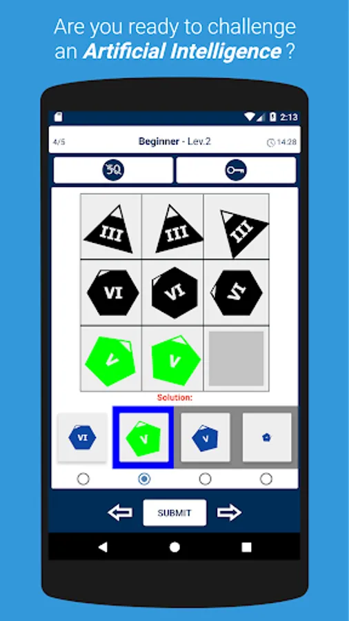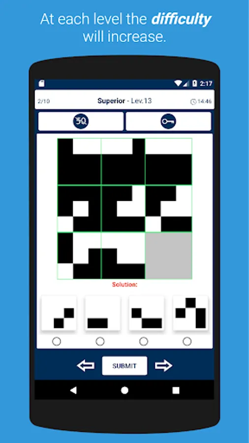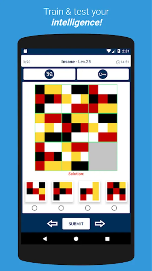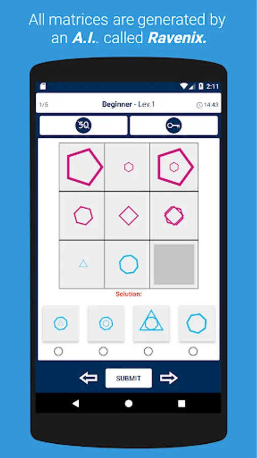 Progress through levels by solving Raven's progressive matrices.