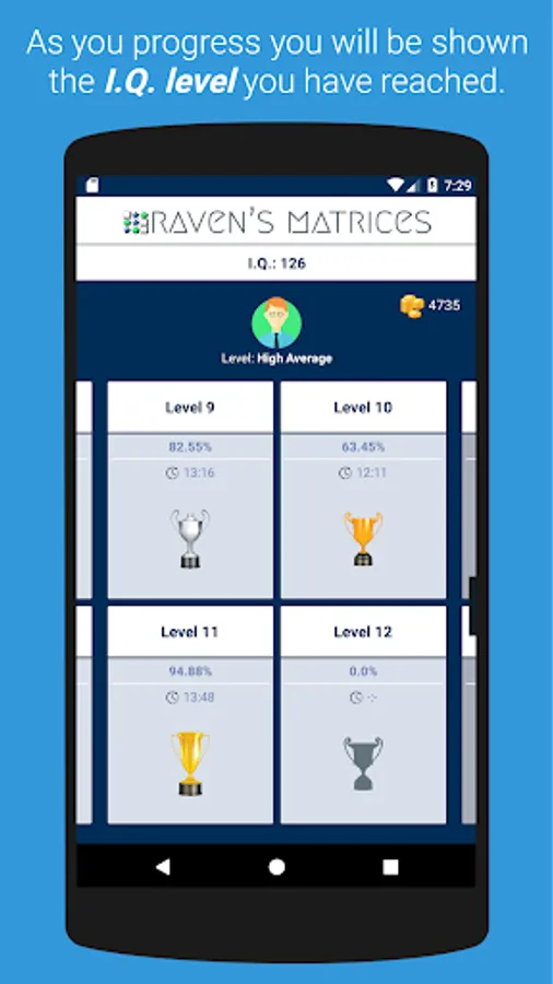 Track your progress and see your IQ level as you go.