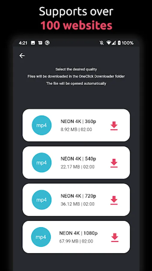 One Click Video Downloader auto detects videos from the link you share, you can download them with just one click. The download is fast and easy to manage. It includes a video player with 4K resolution to quickly preview your videos after you download them.