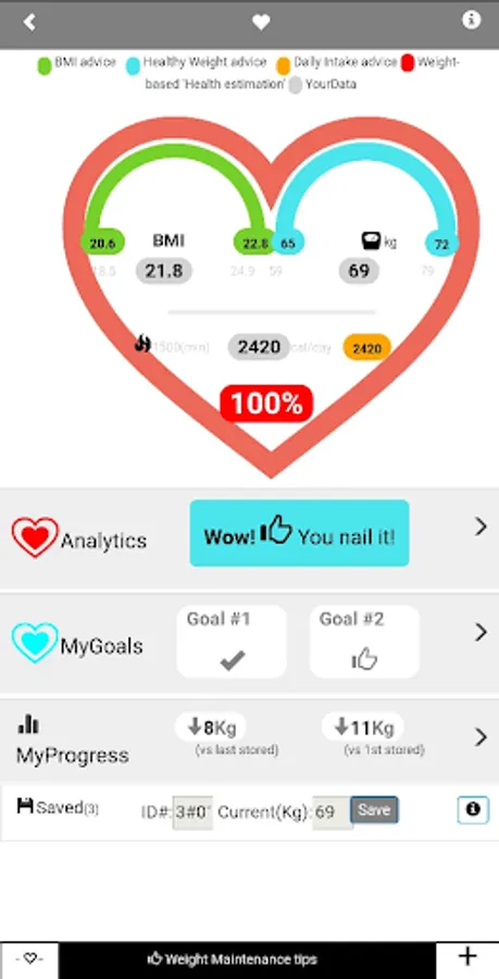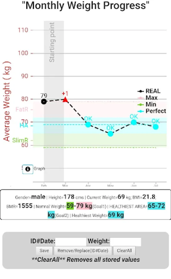 You can use this app to determine your ideal and Healthiest body weight. One-click-to health app can help you determine if you should be considering a meal or fitness plan.Your BMI, Ideal Weight and HEALTHIEST AREA measures will give you an idea of your current health status so that you can use this information as starting point for designing your weight loss / fitness plan.