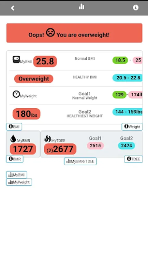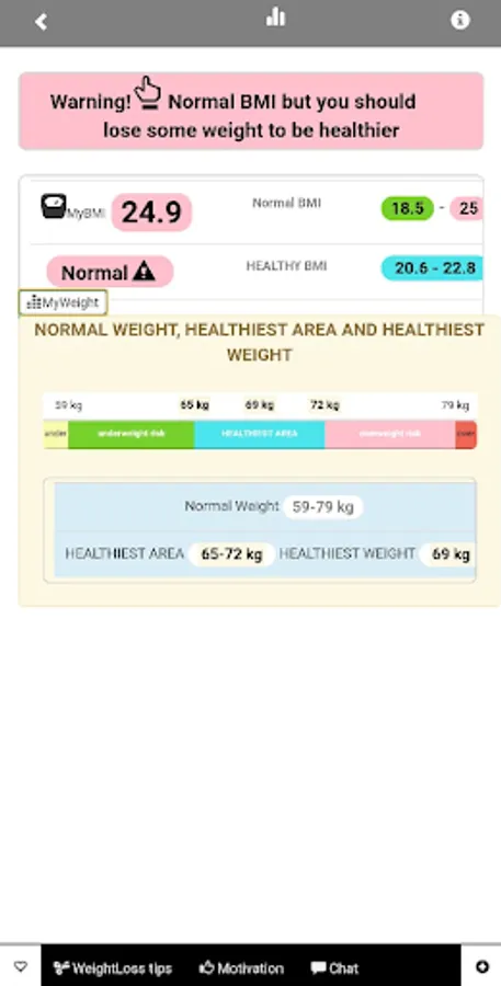 4) Pop up Weight and BMI charts with your BMI category for each BMI range so that you will know more about your current weight, BMI, future predictions etc