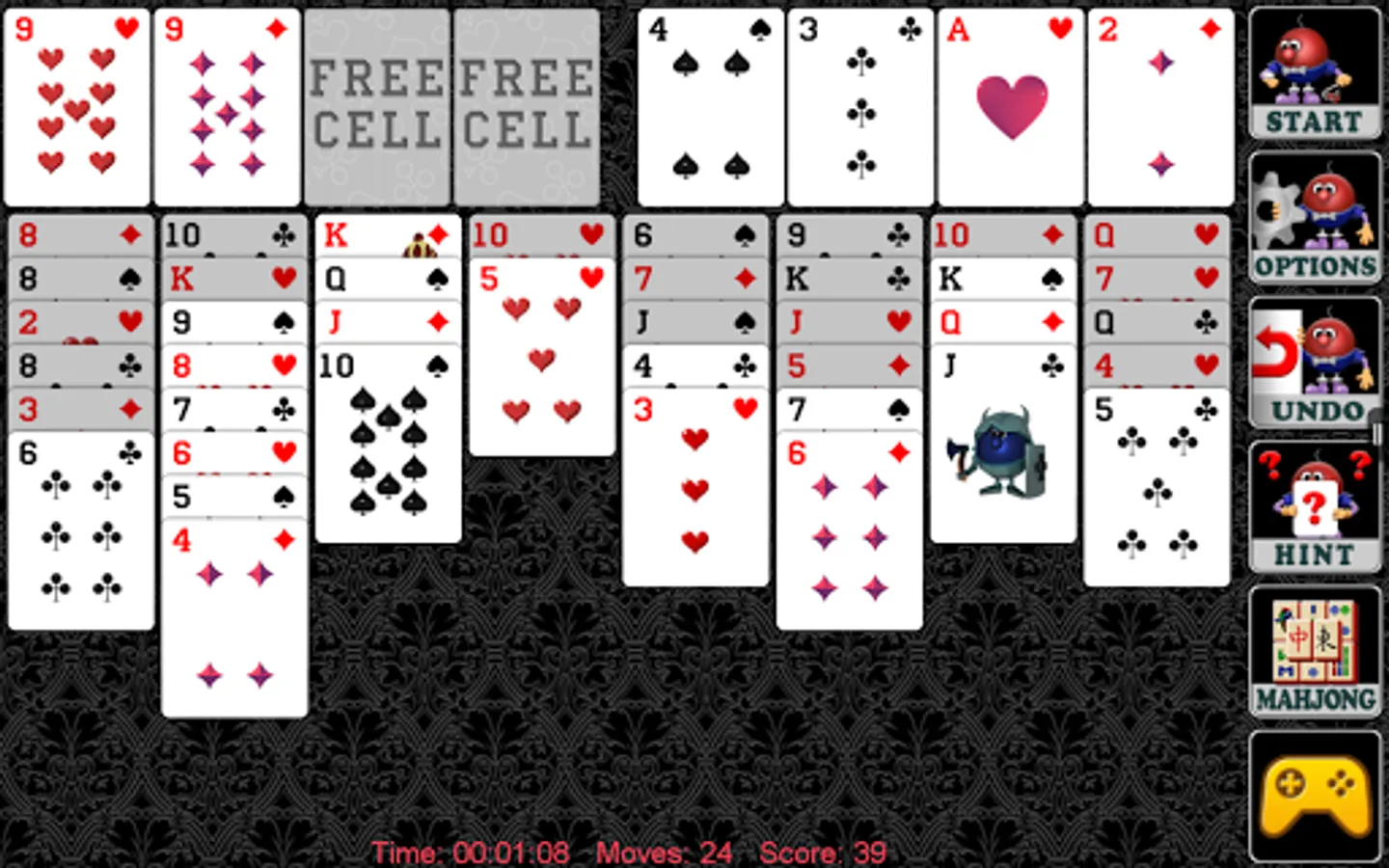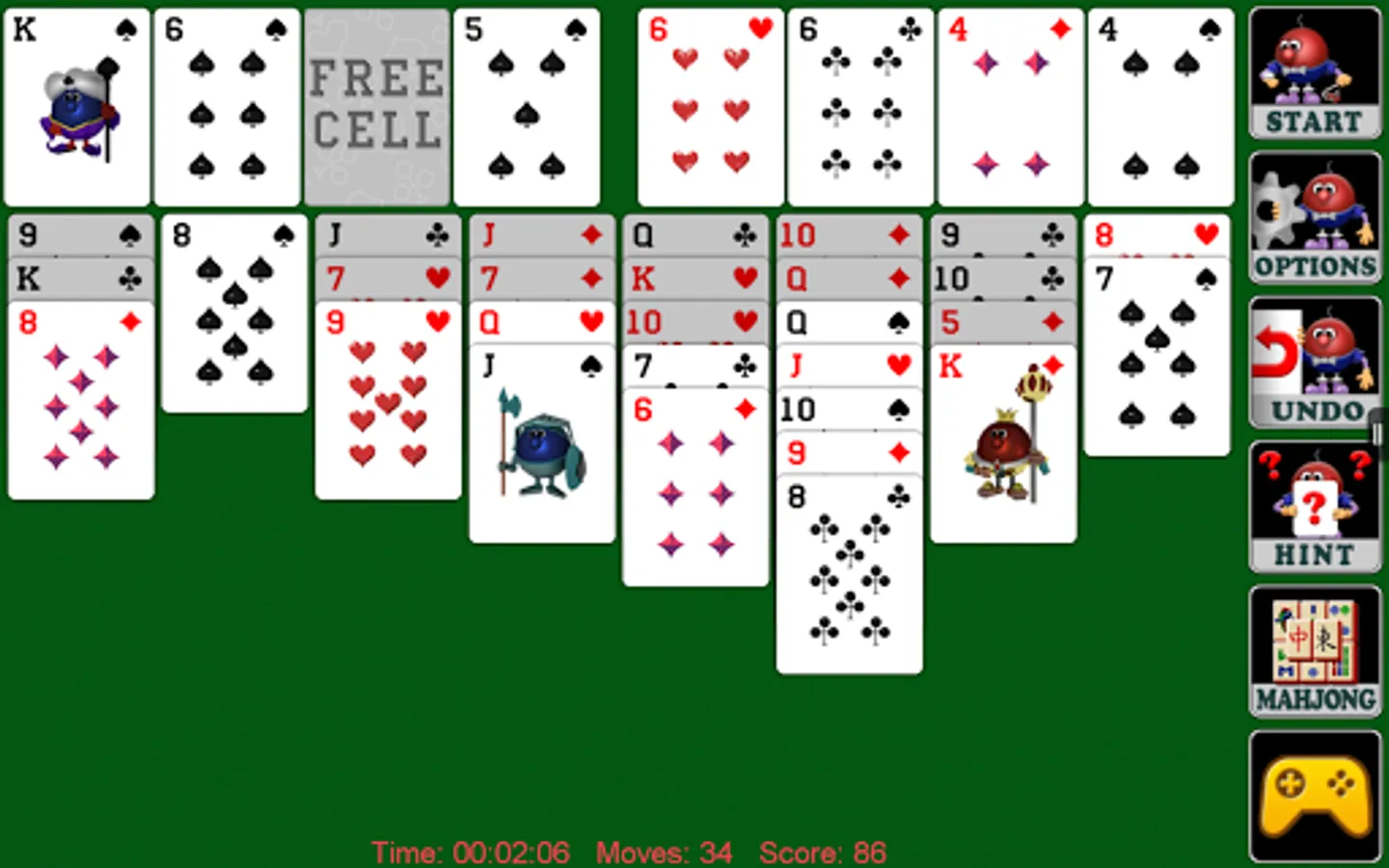 Freecell Solitaire is a classic solitaire card game with elements of strategy & puzzles. Plan your strategy as you use the four free cell spots as placeholders while moving all of the cards from the Tableau to the foundation piles. Stack all 52 cards from a standard deck to win the game!