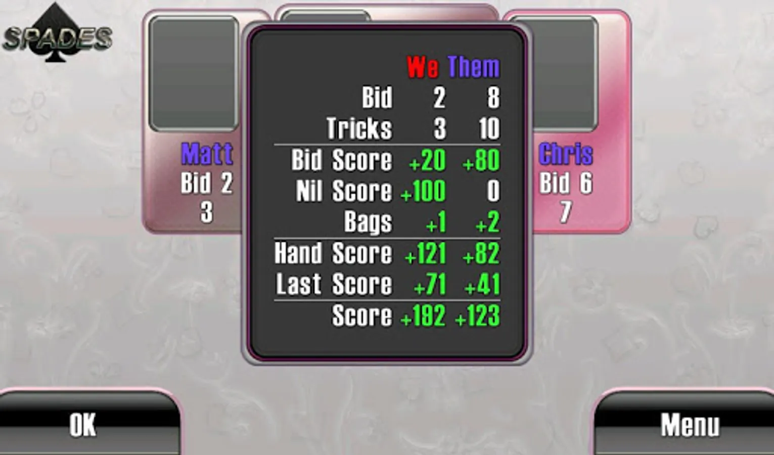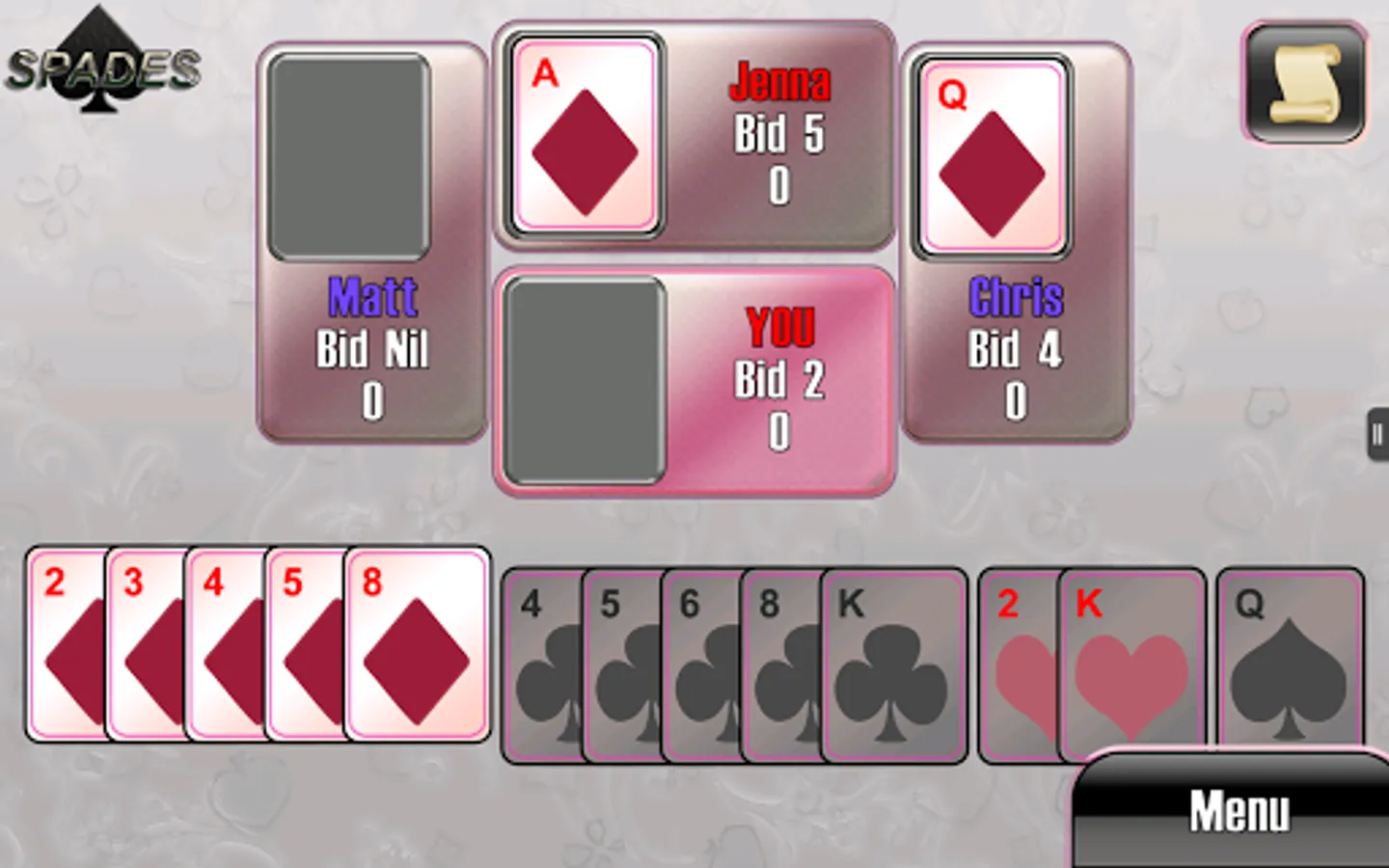 The goal of Spades is to reach 500 points with your team. Players sitting opposite each other play as a team. The game begins with a round of bidding. You try to predict the number of "tricks", or turns, you will win. The combined bids of two partners make a "contract". Once the bidding is completed, the partners must fulfill their contract, not the individual bids. You make a contract by winning at least a contracted number of tricks. A bid of Nil means the player will try not to win any tricks. The "trump" (or highest value) suit is always Spades. Each contracted trick is worth 10 points. If you fail to fulfill the contract, a penalty is the entire value of that contract. Each overtrick, or taking more than you bid, is worth 1 point and also earns you one "bag". Every set of 10 "bags" incurs a 100-point penalty. Winning a Nil bid is worth 100 points, failing a Nil bid is penalized by 100 points.