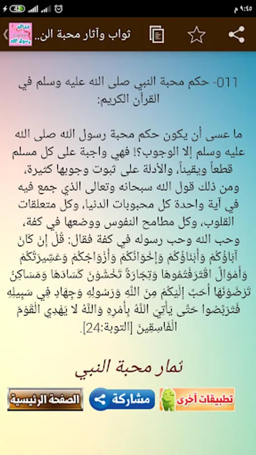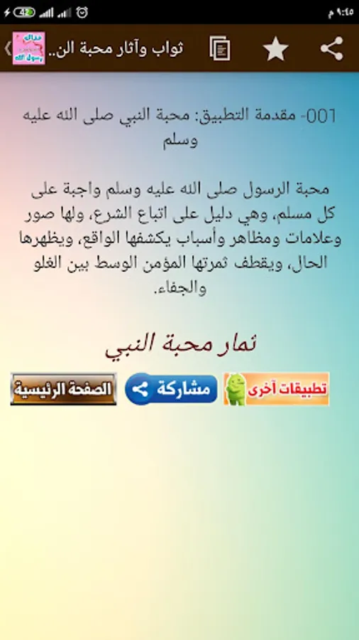 Reap the fruits of the love of the Messenger, may God bless him and grant him peace, you will feel while reading the application with us that you love the Messenger as it should be .. The love of the Messenger, may God bless him and grant him peace, is obligatory for every Muslim, and it is evidence of following the Sharia, and it has pictures, signs, manifestations and reasons that the reality reveals, and the situation shows it And the fruit of the believer picks the middle between exaggeration and alienation.