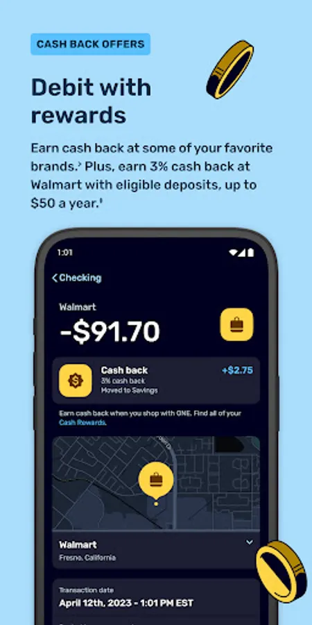 ‡To receive 3% cash back, eligible customers (at the time their purchase settles) must (a) have received $500 or more of eligible direct deposits in the previous month, or (b) have a total account balance of $5,000 or more 3% cash back is limited to up to $50 per year and applies only to purchases made at U.S. Walmart locations and on Walmart.com. This promotion may not be combined with other ONE promotions that offer cash back on purchases at Walmart. Terms Apply. See ONE.app/promo-terms