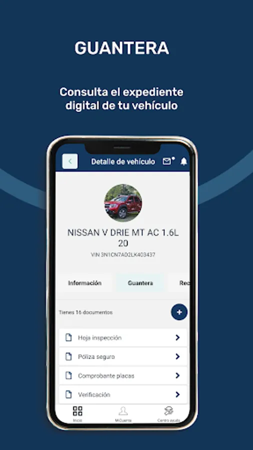 - Consulta documentos escenciales como póliza de seguro, tenencia, verificación y tarjeta de circulación.