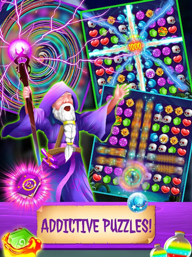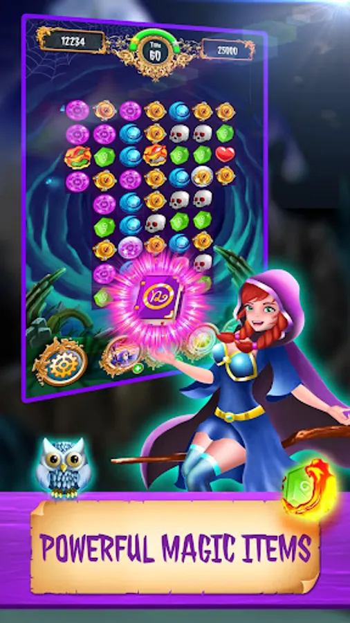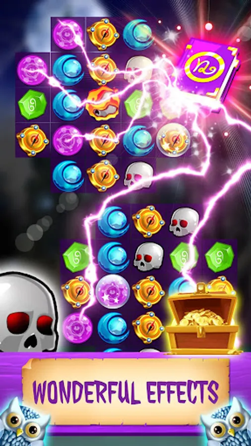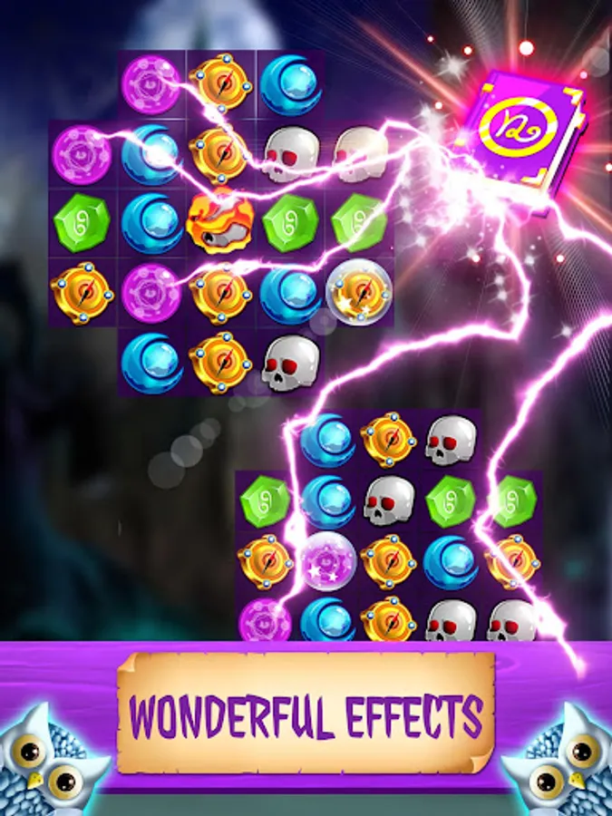 Each time you match more than 3 items of the same type, or more advanced items such as Magic Fire, Crystal Ball and Magic Book will create an explosion to destroy items and new items.