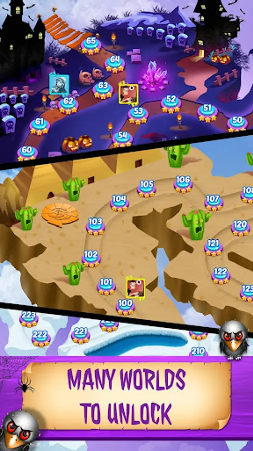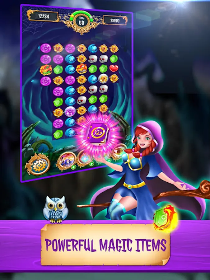 Explore the magical world of Magic Jewels: Match 3 Games includes the Witch city, magic school, castle, hills, waterfall, cemetery, haunted house, graveyard, island, cave…