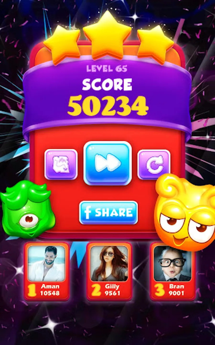 Splash and blast the jellies by connecting three or more matching items. Connect as many similar props as you can in a single touch and make the longest line to unfold sweet surprises. This will help you finish the game levels quickly and earn more Candy stars. The more jellies you blast in a single line, the more you enjoy!!!
