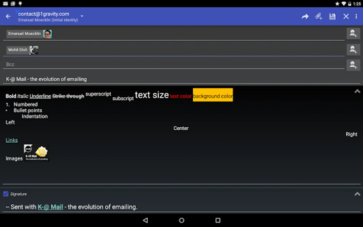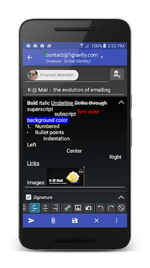 ★ Rich-text editor to format text including the signature: bold, italic, underline, strike-through, superscript, subscript, text size, text color, background color, numbering, bullet points, indentation, left/center/right alignment, links, images, undo/redo.