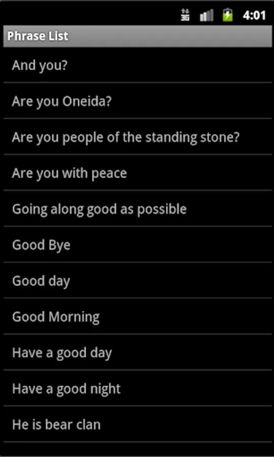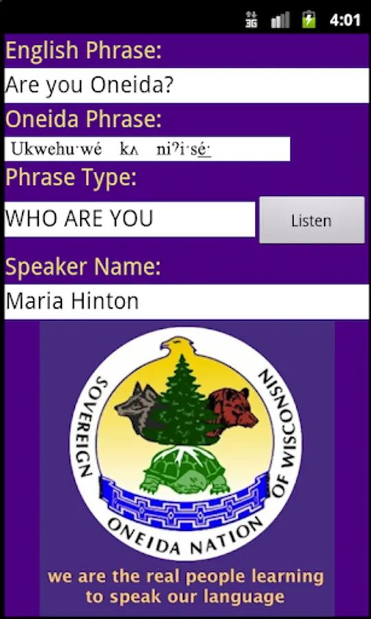 As a user friendly option, the "Oneida Language" application provides sound files and the traditional Oneida written spelling of each phrase. The sound files are provided to allow the user to hear each Oneida phrase being spoken. The Oneida written phrases are provided to allow the user to see the traditional spelling of each Oneida phrase.