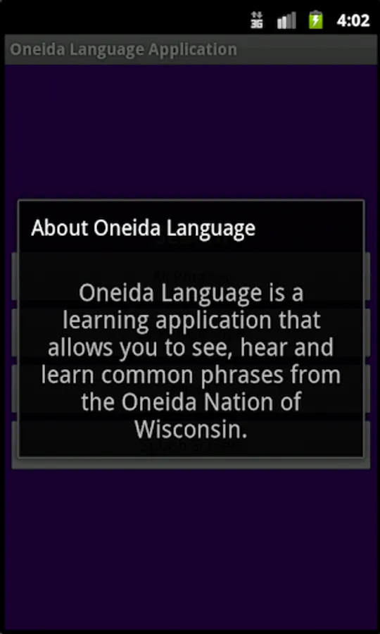 The goal of "Oneida Language" is to provide correct, accurate and commonly spoken Oneida phrases to everyone interested in learning and preserving the Oneida language. This application is the perfect educational learning tool for anyone interested in learning the traditional language of the Oneida Nation of Wisconsin.