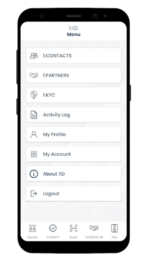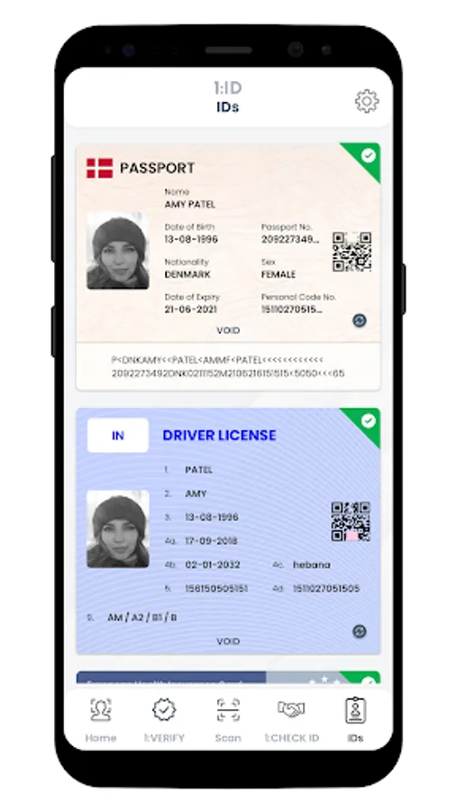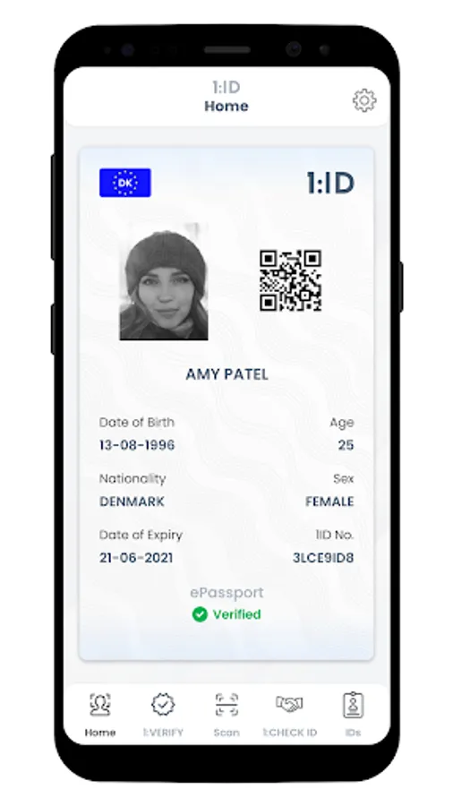 1ID is a digital profile to be used for personal identification and sharing of data. When you create a digital profile we NFC read your Passport, OCR scan your Driver License, and exhibit designed versions in the app. Be aware that these designs serve as illustrations ONLY, and are VOID as government issued IDs, and as such NOT validated NOR certified by issuing authorities.