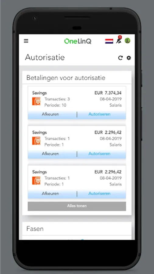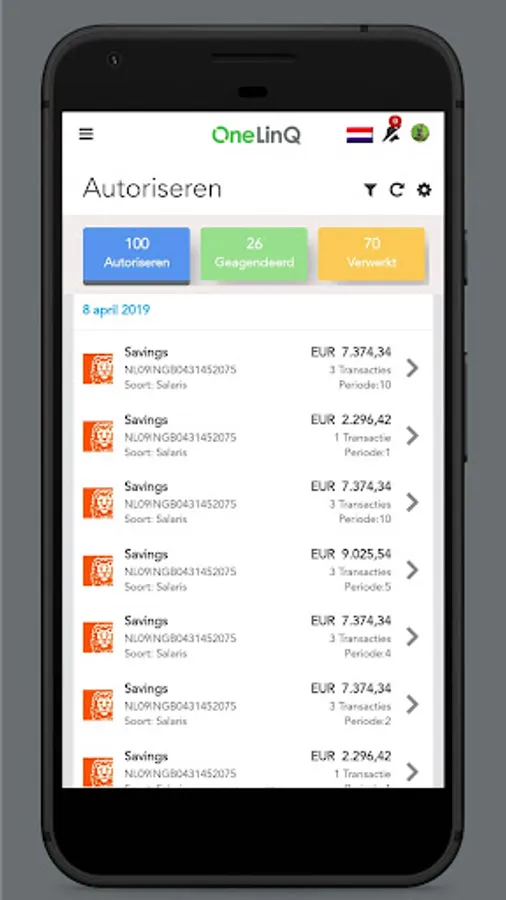 OneLinQ SalaryPay makes a link with your bank to easily pay approved salary payments and wage payments. OneLinQ SalaryPay automatically retrieves salary payments and wage payments from your salary package. After authorization in the OneLinQ portal, the payments are sent to the bank