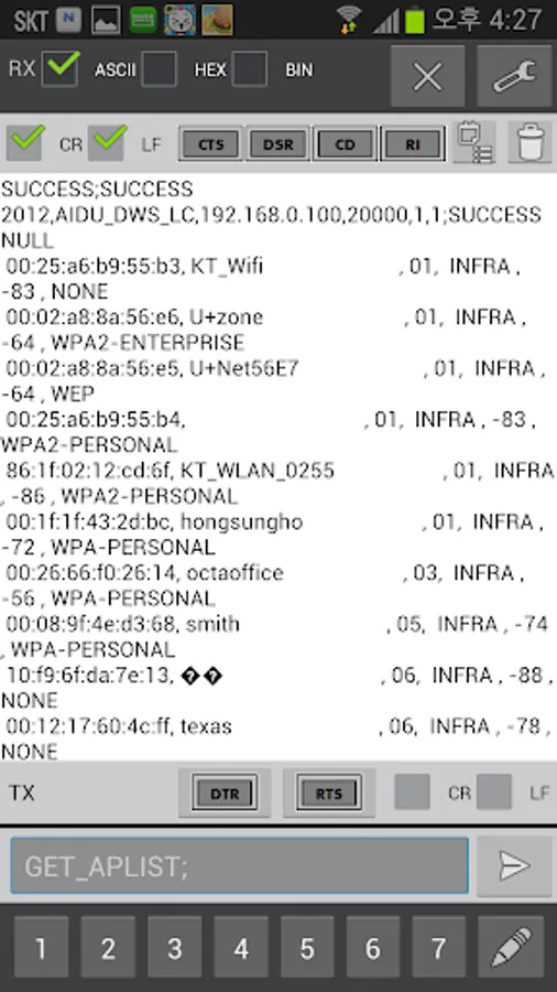 - Modem status buttons: show CTS, DSR, CD, RI pin status
