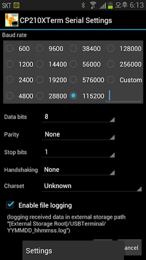 Select enable file logging for logging received data in external storage path "[External Storage Root]/USBTerminal/YYMMDD_hhmmss.log".