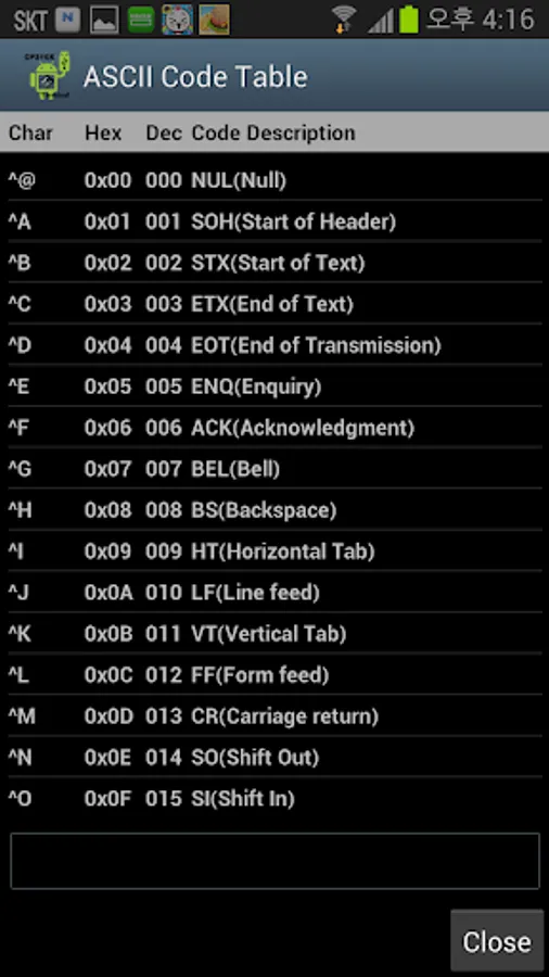 - ASCII Code Table: ASCII code table lookup and input window will open.