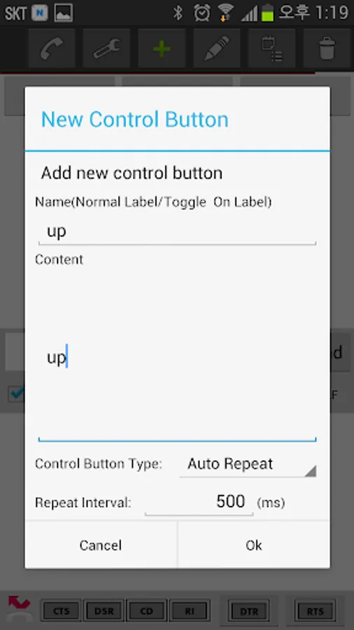 6) Click "add conrol button"(Plus icon) in toolbar, and then input name and content to send