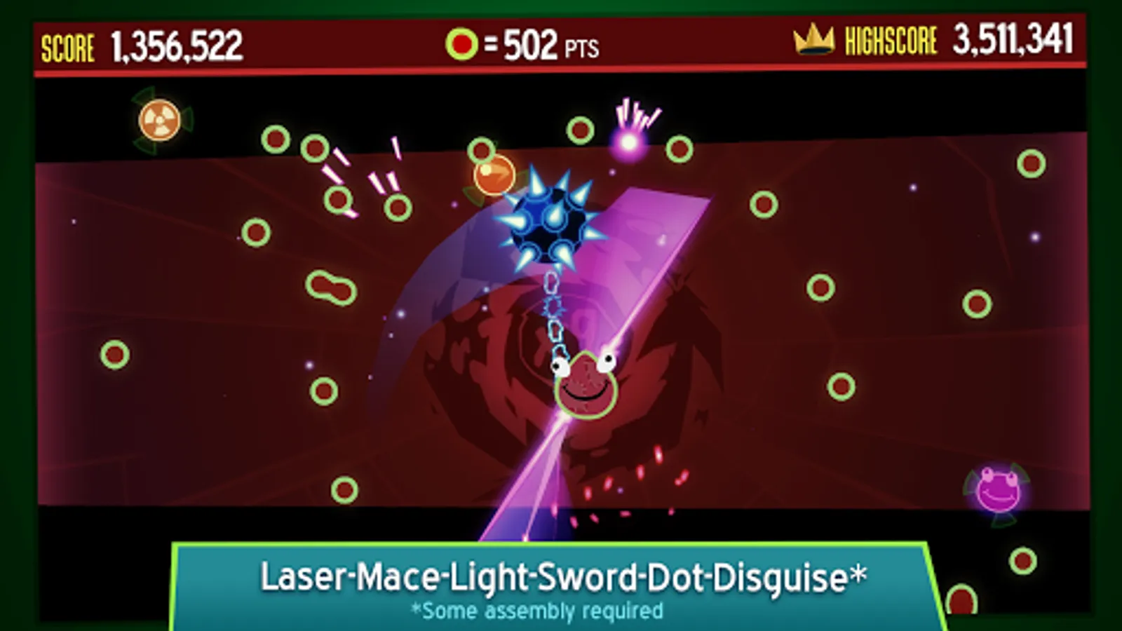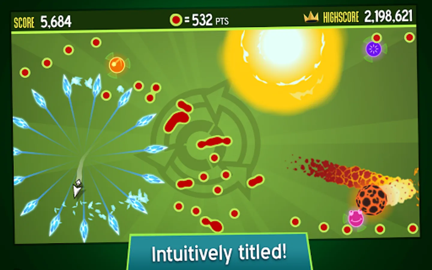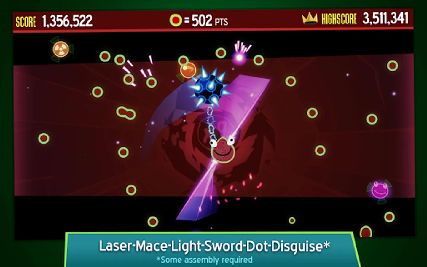 Return to a world of fast-paced, tilt-only arcade action! You’ll flee a relentless onslaught of dastardly dots, desperately darting between single-use weapon orbs. Each orb provides a unique burst of fiery relief! Sometimes it’s lasery relief. It really depends.