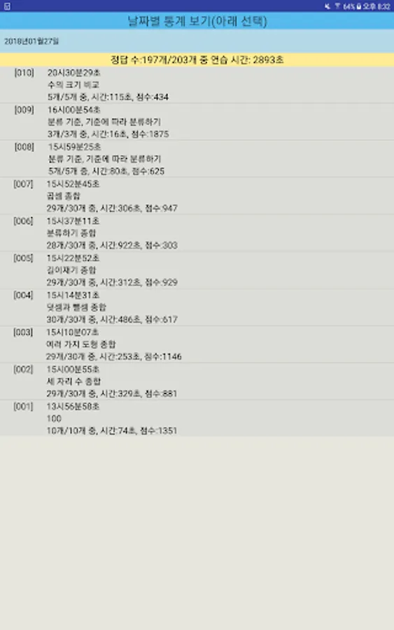 7. In the statistics column was so children can determine whether and when to exercise any information, you can check the results when extracted problems and weak so that children can know what the problem, click the part.