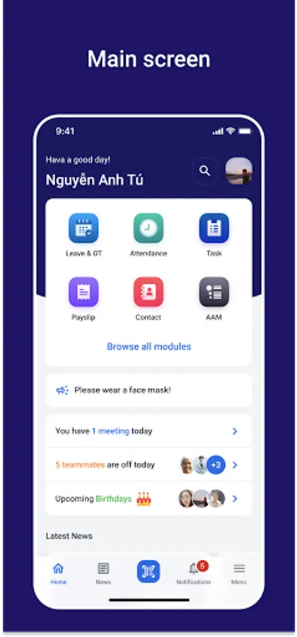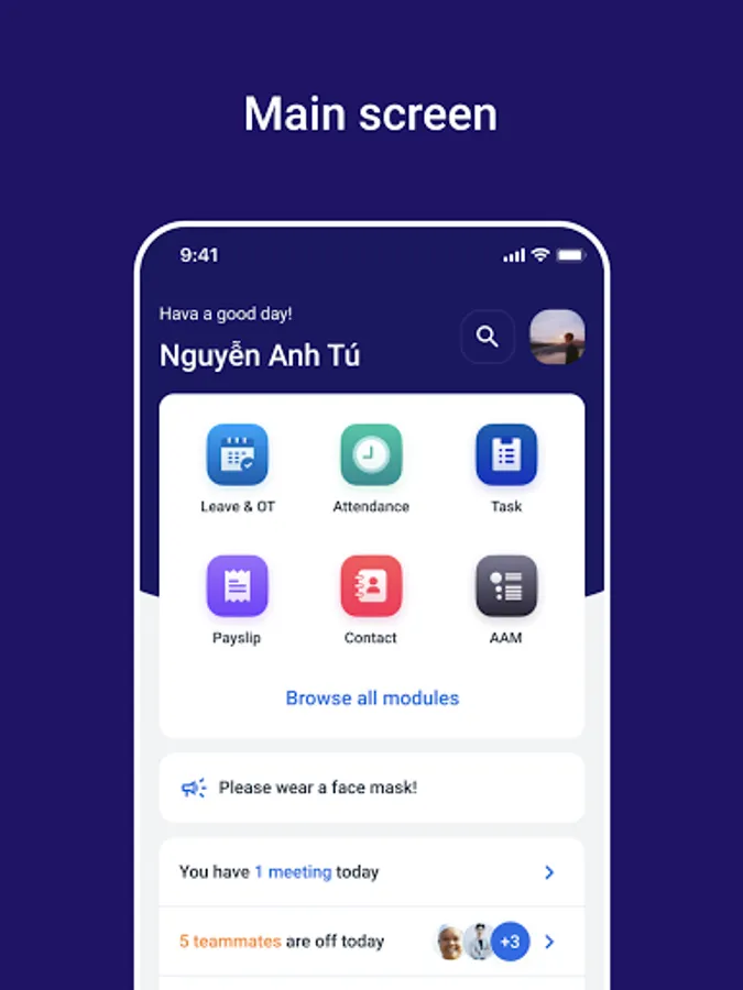 Ứng dụng nội bộ của tập đoàn One Mount và các công ty thành viên, mục tiêu của chúng tôi là mang đến sự tiện lợi/thoải mái nhất cho toàn thể cán bộ/nhân viên tập đoàn, qua đó nâng cao tương tác, sự thỏa mãn, lòng nhiệt thành trong mọi nhiệm vụ. “Để mỗi ngày đi làm tựa như đi chill”