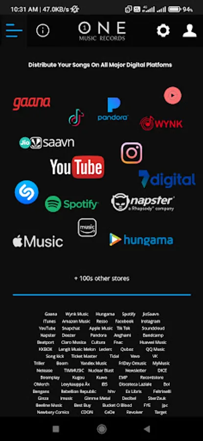 Distribute yours unlimited songs on Gaana Wynk Hungama, etc and hundreds of other digital stores worldwide!!! Keep 100% of your earnings!
