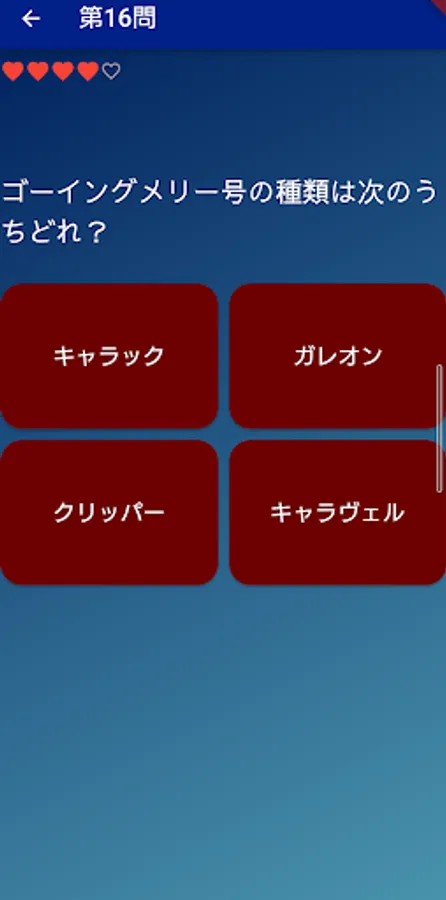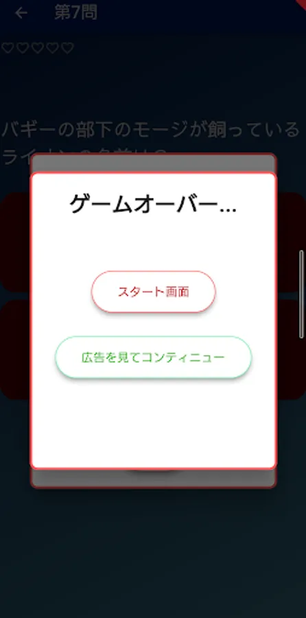 If you get 5 questions wrong, the Heart Gauge will drop to 0, and you can choose to start from the beginning or watch an ad and continue from there.