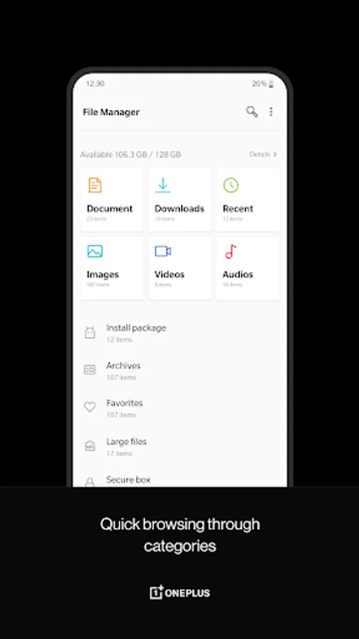 • Quick browsing through categories like: file type, downloads, recent files, and large files.
