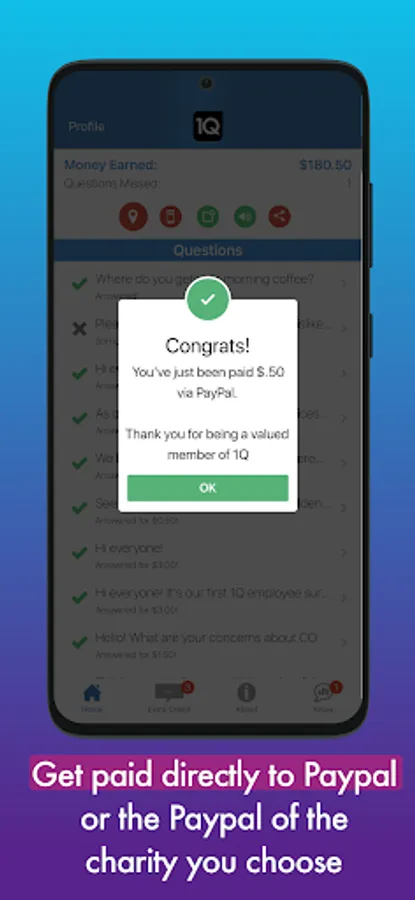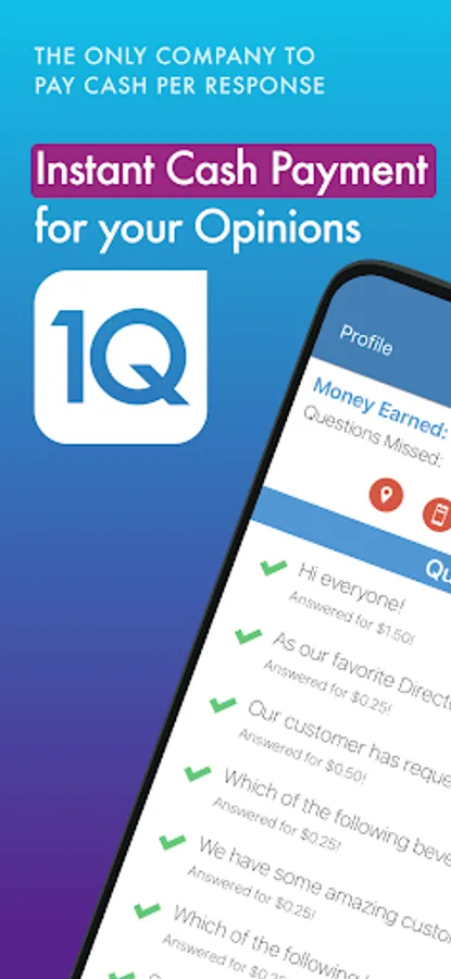 Who is 1Q? 1Q connects top brands to a panel of consumers who want to be rewarded for their candid feedback. 1Q is the only company in the world to pay consumers up to $0.25 instantly, per question, directly to your PayPal account. Join over 1 million people who have already started being paid for their valuable opinions. Join now and turn your opinions into cash.