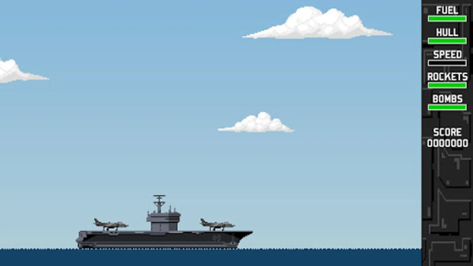 The aim of the game is to take-off from the aircraft carrier, and fly towards the enemy island. You will have to speed-up your Harrier or it will run out of fuel before getting all the way over the island. You will also have to avoid the guided missile launched by the enemy patrol boat.
