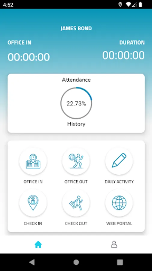 1. Provide your attendance with through the app press the button "Office in", where a map will pop up with your location. Press save button and that's it. Your attendance will be save on our cloud service with your location and time.