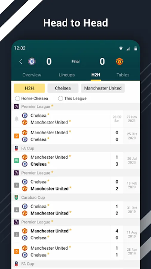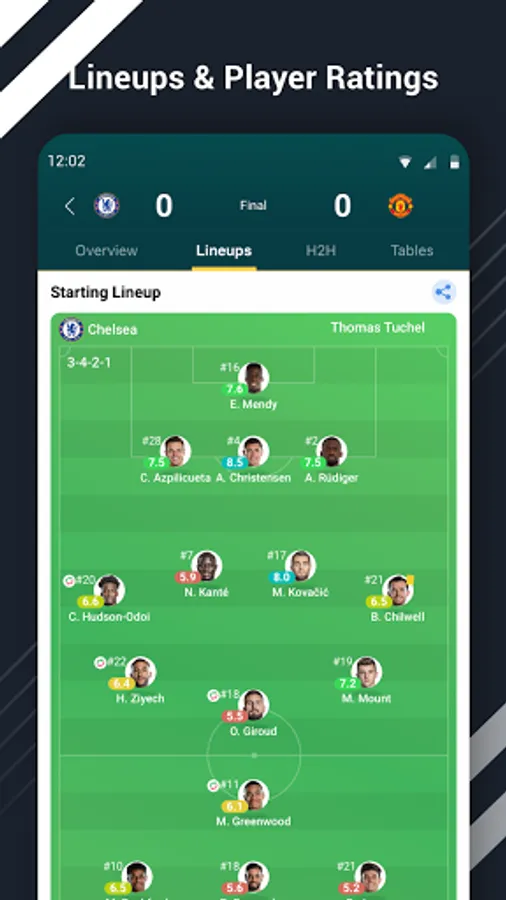 Lineups - Starting lineups and player ratings.H2H (Head to Head) - Historical clashes between the two teams and recent forms.Standings - Real-time standings and historical standings for more than 20 seasons.
