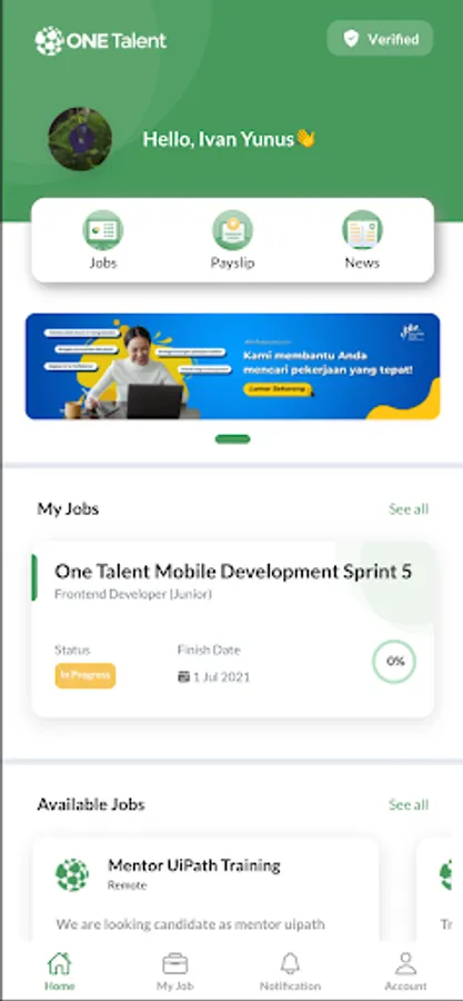 Aplikasi ONE Talent adalah aplikasi yang menjadi sarana pengembangan dan penyaluran talenta di marketplace khususnya untuk bidang Teknologi Informasi.