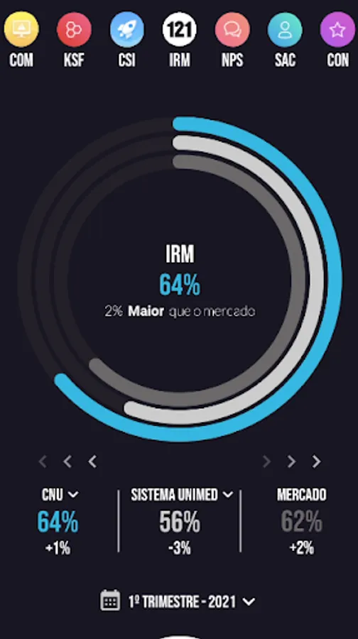 Exclusive access application to analyze and compare the IRM (Intelligence Relationship Management) of healthcare companies. The IRM is a benchmarking used to measure the values of satisfaction, trust, among other indicators of healthcare companies.