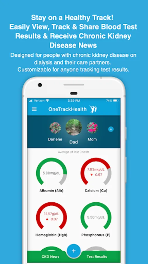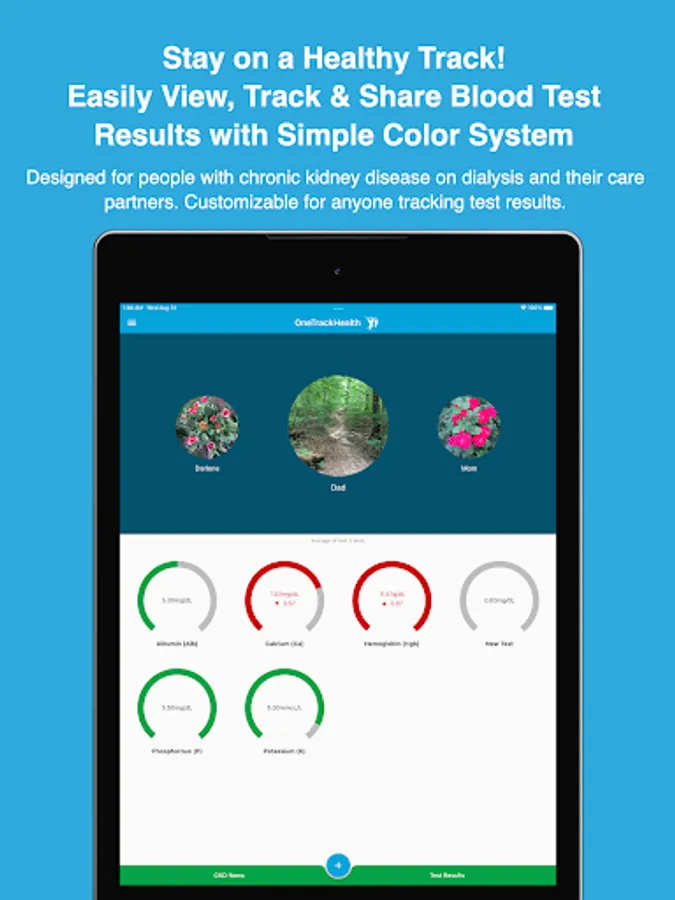 One Track Health is designed for people with chronic kidney disease (CKD) on dialysis and their care partners to easily view, track, & share blood test results, and stay up to date on the latest CKD-related news. The app is customizable so anyone tracking results can use it. Multiple profiles for multiple users can be added.