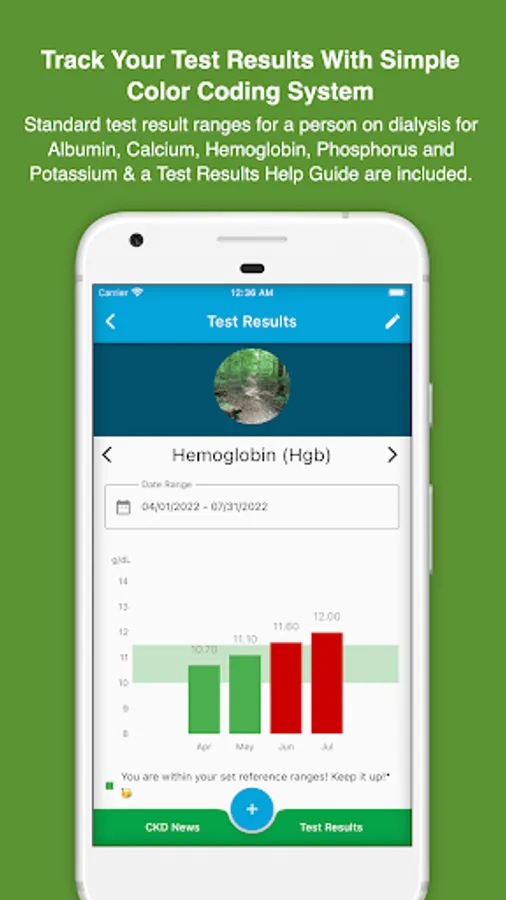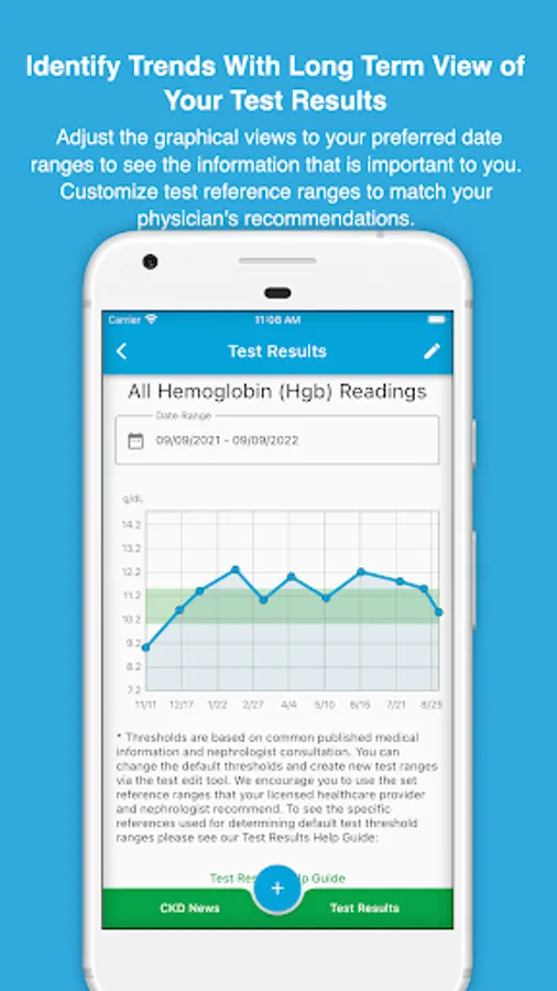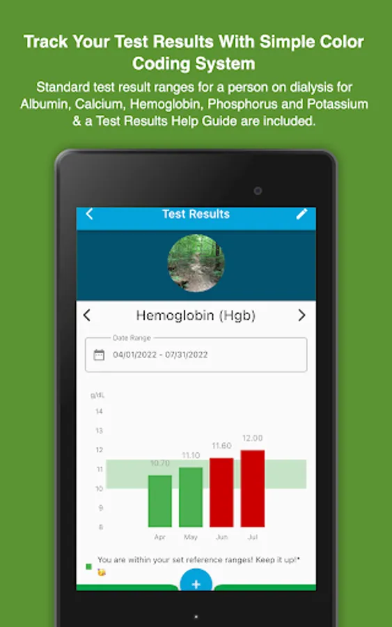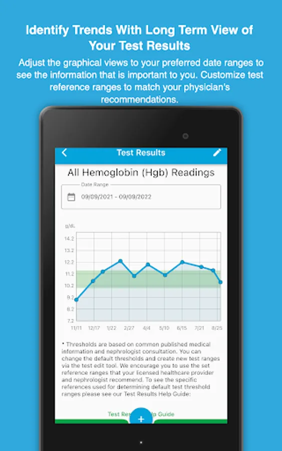 The top dashboard view allows you to see if you are within your set test reference ranges with a simple 2-color coded system. For people on dialysis and their care partners, there are 5 default tests included – Albumin, Calcium, Hemoglobin, Phosphorus and Potassium – with the standard test reference ranges & a Test Help Guide with educational information and references.