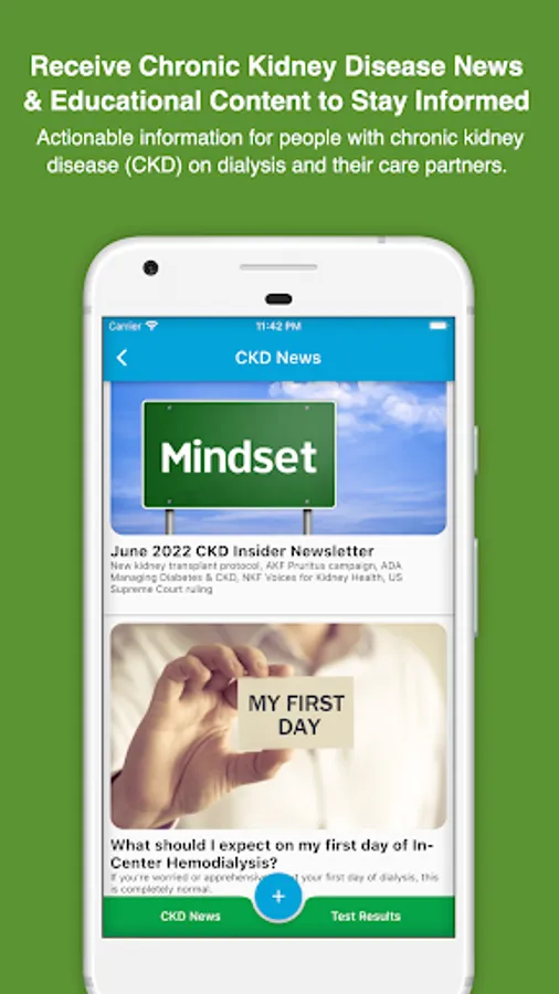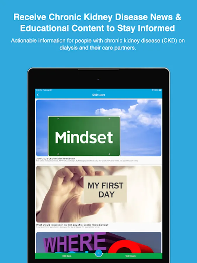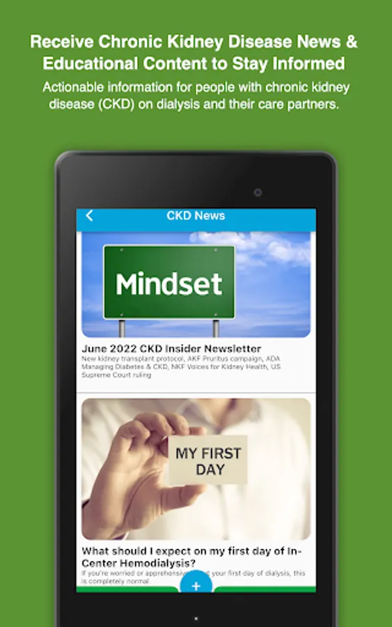 Receive regular actionable chronic kidney disease (CKD)-related news and educational content to keep you and your care partner informed. The CKD Insider Newsletter included in the app helps you stay informed on the latest news from kidney organizations, new FDA approved medications and treatments, advocacy opportunities, educational webinars, clinical trial