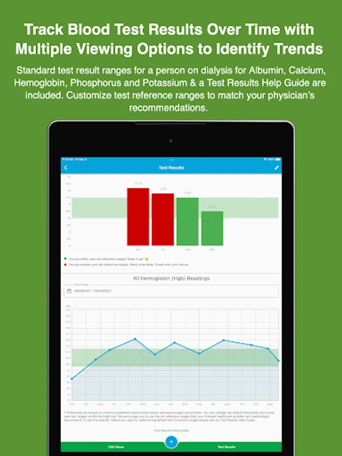 Key blood tests that are regularly monitored for people with chronic kidney disease (CKD) on dialysis (Albumin, Calcium, Hemoglobin, Phosphorus and Potassium) are included in this mobile and web app with standard recommended blood test result ranges for people with CKD on dialysis per NKF KDOQI(TM), KDIGO, UpToDate®, and consultant nephrologist. References used to determine the default test type ranges are included in The Blood Test Results Help Guide. We provide basic reference ranges for your educational purposes and recommend that you consult with your licensed healthcare provider/nephrologist for your specific reference