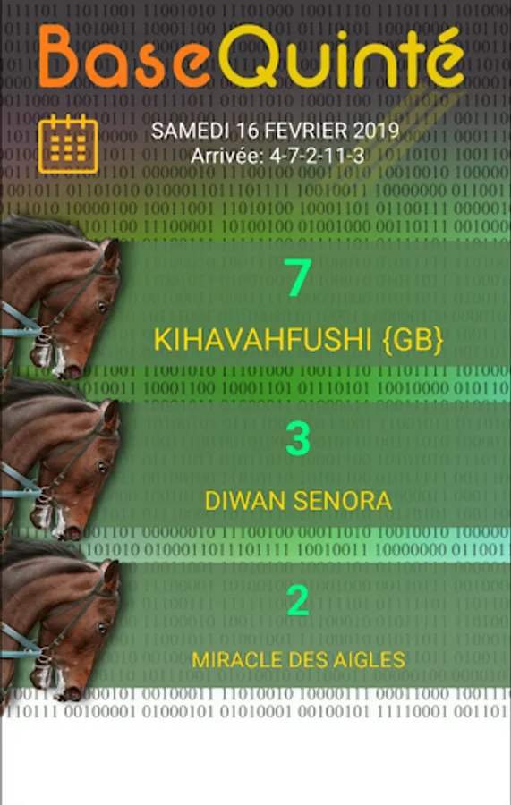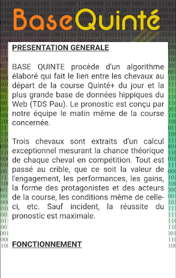 BASE QUINTE regularly displays convincing and profitable results for those who use the prognosis to develop their bets. The application is completely free. An advertisement appears at the opening of the prognosis but is not repeated.