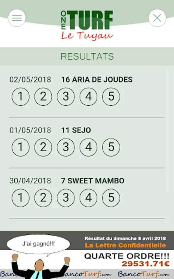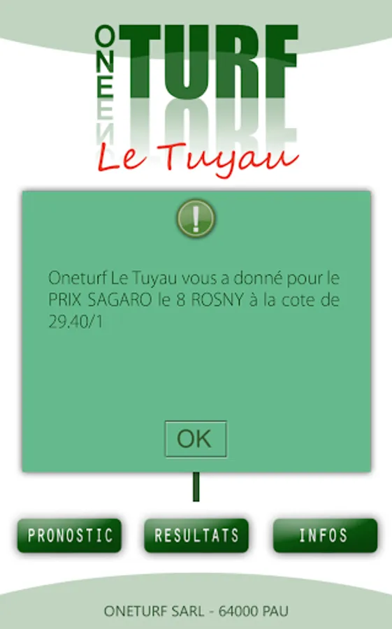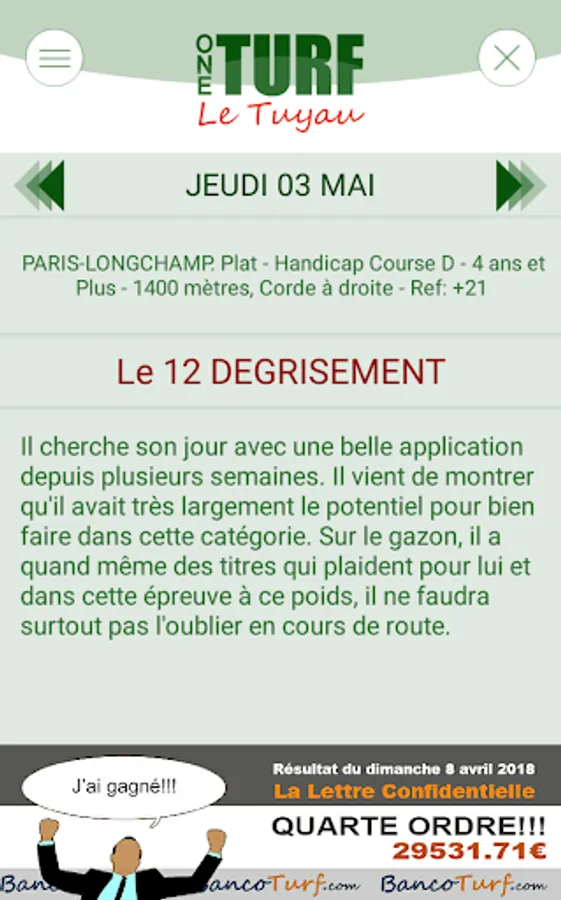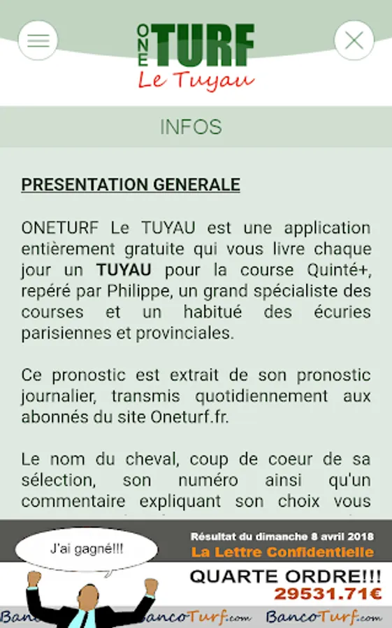 ONETURF LE TUYAU is a completely free application that gives you every day a tip for the Quinté + race, horse spotted by Philippe, a great racing specialist and a regular in the Parisian and provincial stables.
