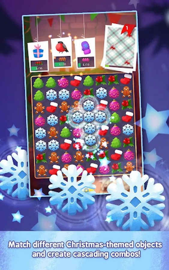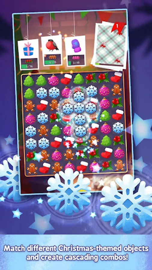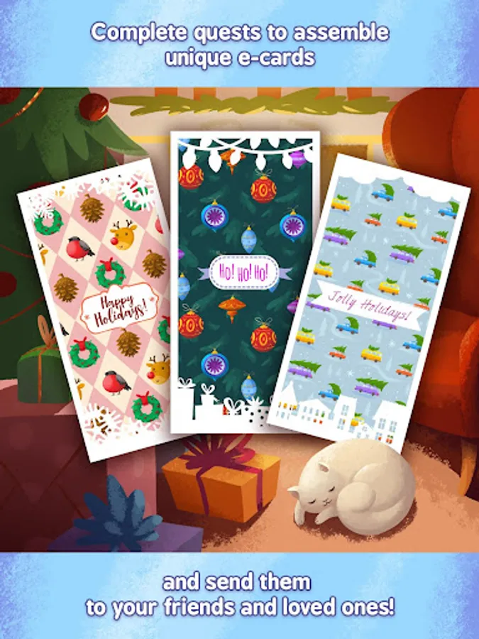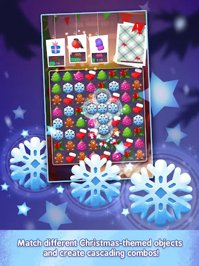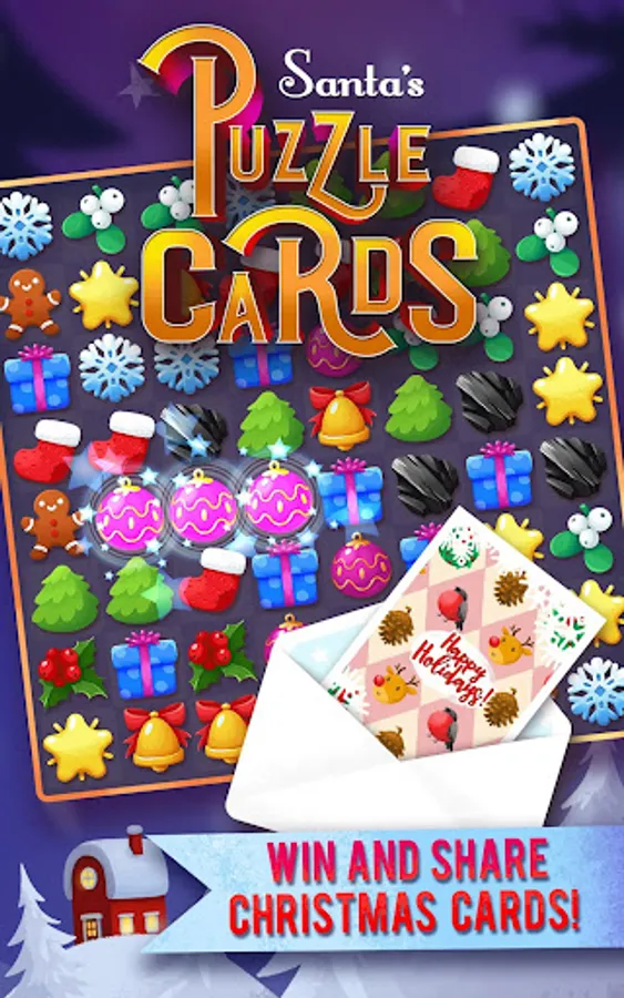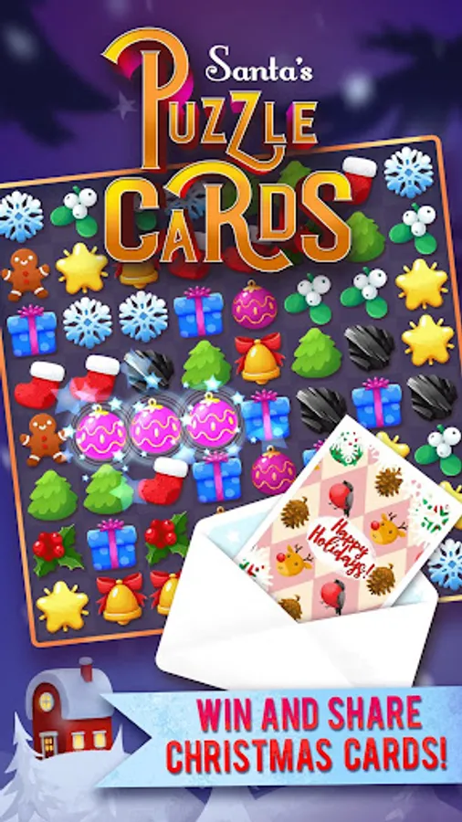 Match different Christmas-themed objects, create cascading combos, complete quests to assemble unique e-cards and send them to your friends and loved ones!