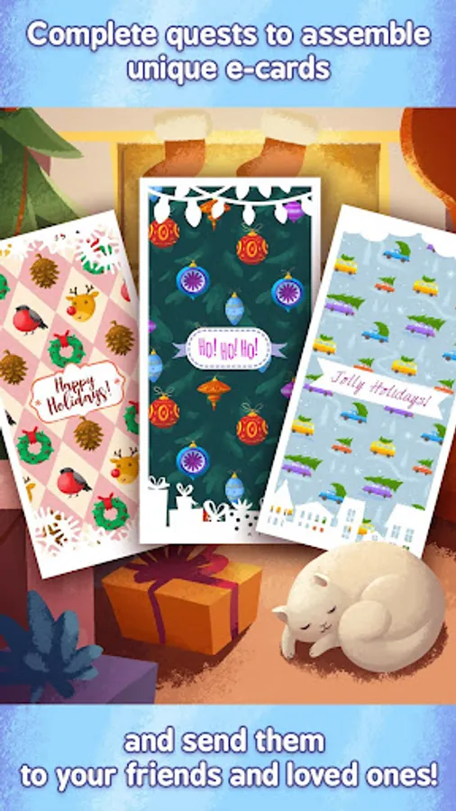 Imagine yourself sitting by the fireplace, cozy and warm. Christmas is around the corner and almost everything is ready: gingerbread cookies along with hot chocolate on the table, snowflakes on the window, stockings full of presents, mistletoe flowers everywhere and of course the Christmas tree dressed in decorations of all kinds. But wait, there's something missing! Of course! E-cards for friends and loved ones! And that's where we can help you. We provide you the most relaxed e-card creation ever! Play our new match-3 game, complete quests and step by step assemble your own unique postcard and share it with anyone you like via any messenger or email!