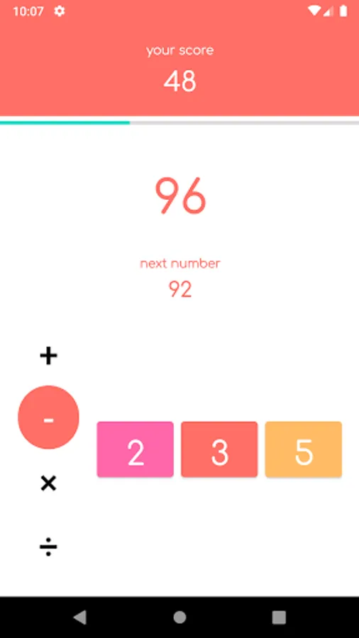 Use 2, 3, 5 and addition, subtraction, multiplication, and division to create any number! You can make all numbers by just adding and subtracting, but if you use multiplication and division, you can reduce the number of times you press the button, right?