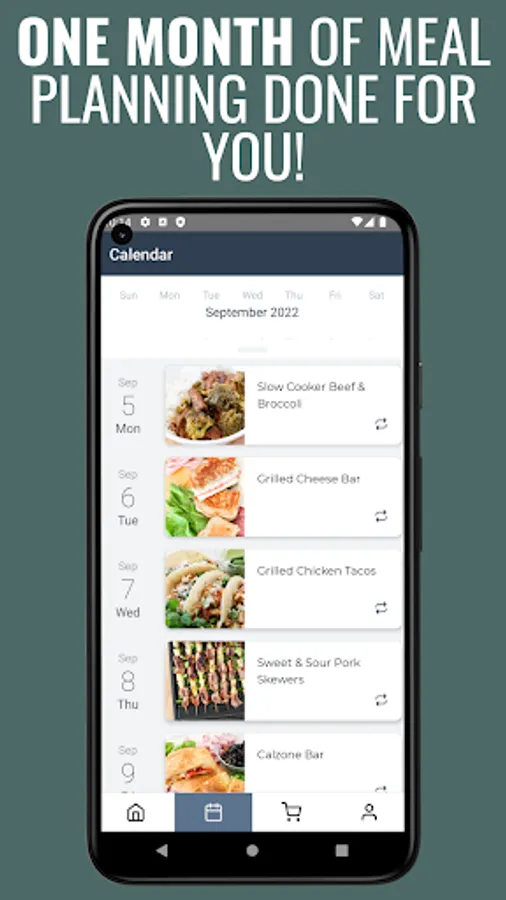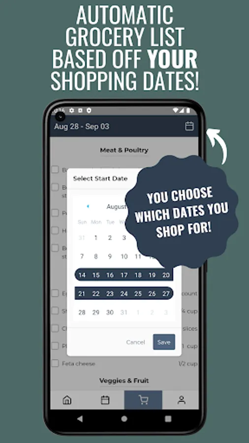 The grocery list feature is one of a kind! You get to decide which days you want to grocery shop for! So if you shop weekly, bi-weekly, or monthly it still works for you! You select the dates you want to shop for and your grocery list will be automatically updated.