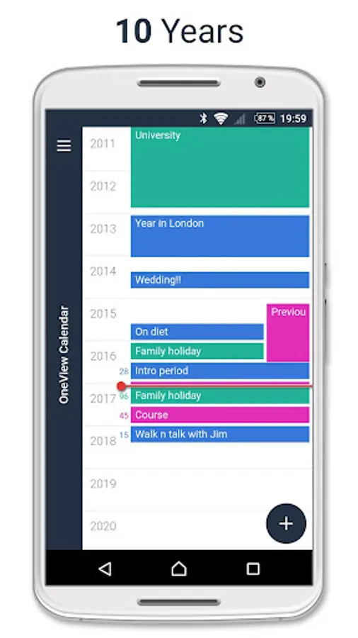 A timeline is the clearest and most natural way of showing events in time. We've seen it in ancient history books as well as on Facebook and it's a great way to get a good overview. Most calendars use month views, week views and day views, which show time as a grids and pages and not as a timeline. The agenda view, on the other hand, is a timeline. All of the days and their events line up one after the other. The agenda view may be a timeline, but it isn't proportional since some days might be missing and some days might be much bigger than others. OneView calendar is a proportional timeline in the sense that every day is there and every day is the same size and a week seven times bigger than a day and so on. This is important because it helps you get a proper feel for the things you have planned ahead and how much space there is between each planned event. To make things even better OneView Calendar is an infinetly zoomable and proportional timeline. Enabling you to quickly look at 2 weeks, 3 months, the summer holiday or even years at once.